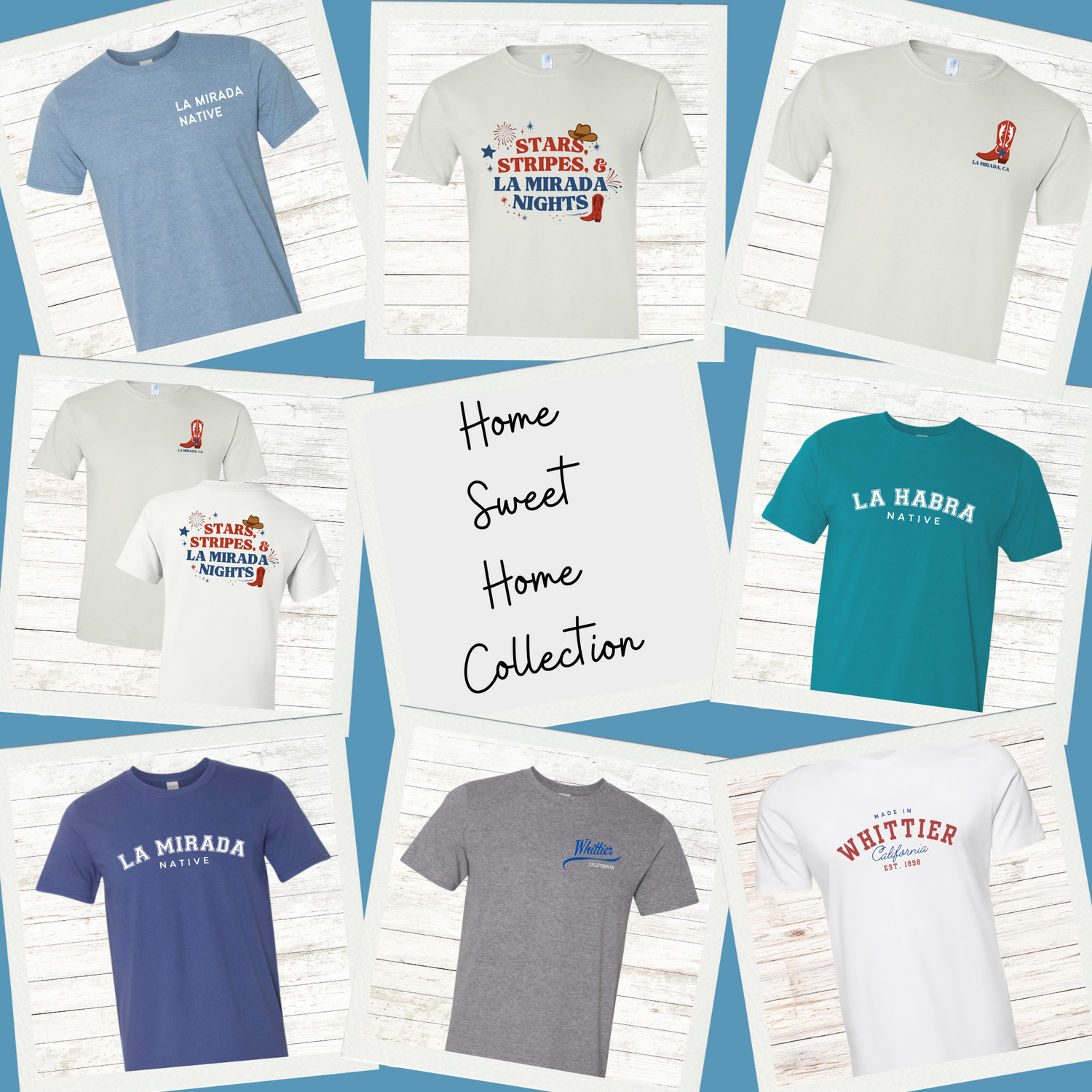 Show off your city pride with our Home Sweet Home collection! Featuring custom t-shirts, sweatshirts, and tote bags with your hometown name—perfect for gifts or repping where you're from.