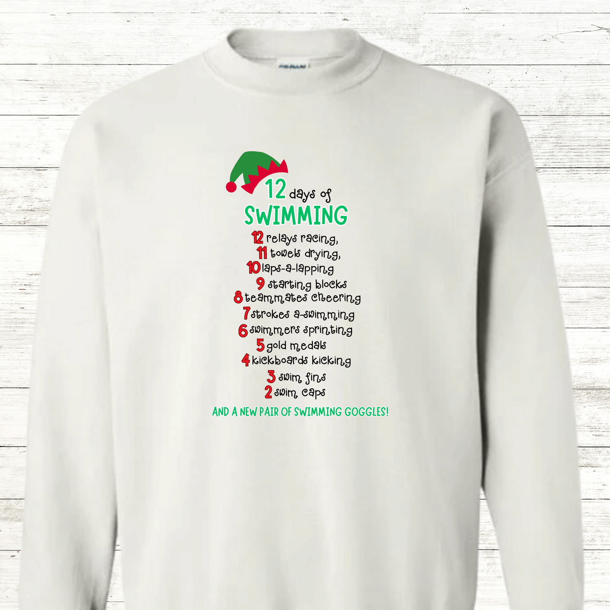 Celebrate the holiday season with a splash and showcase your love for swimming with the "12 Days of Swimming - Christmas Edition" design. Choose your favorite shirt or sweatshirt and enjoy the festive cheer!