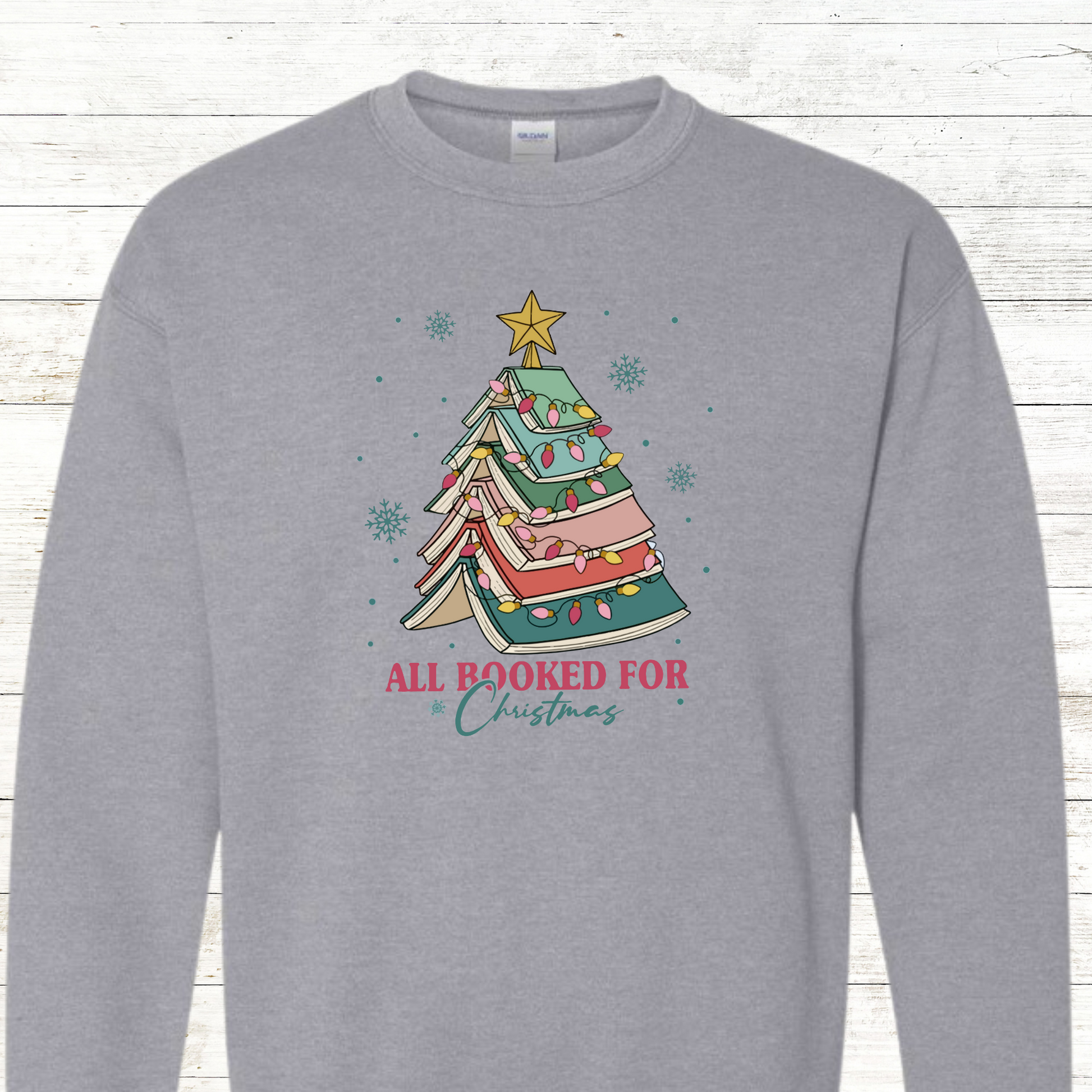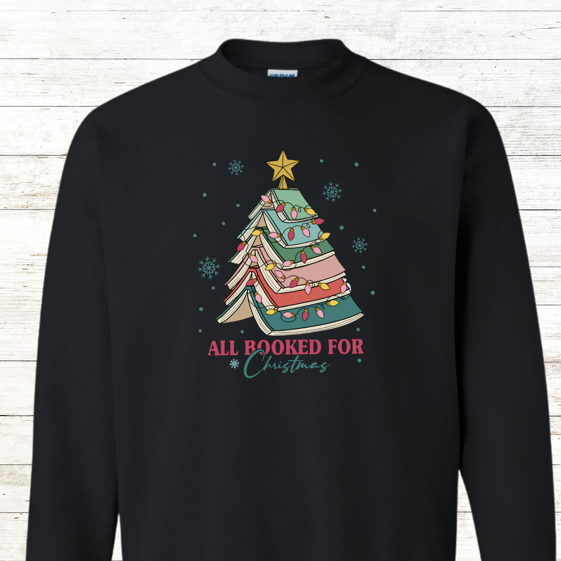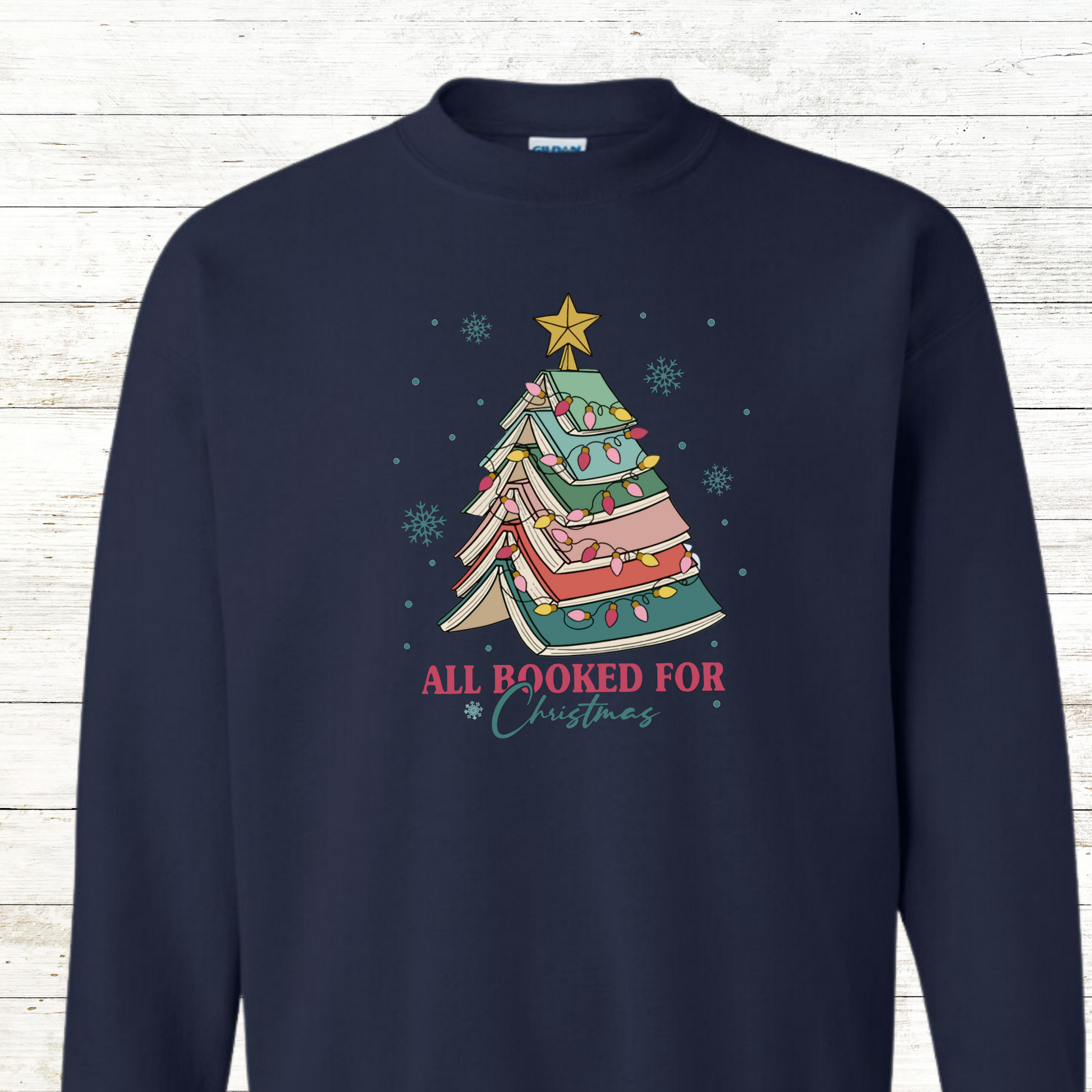 This All booked for Christmas Adult Sweatshirt comes with free shipping. For an additional charge, the back of this sweatshirt can be personalized for an added touch.