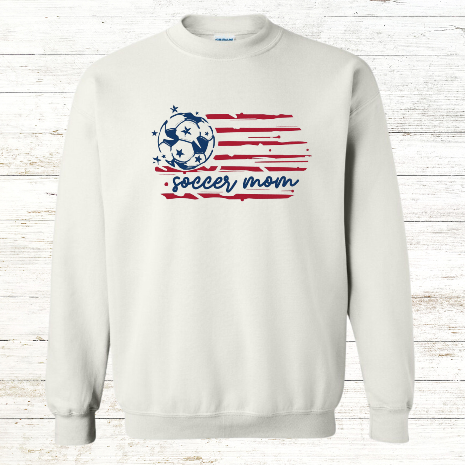 This American Flag Soccer Adult Sweatshirt comes with free shipping. For an additional charge, the back of this sweatshirt can be personalized for an added touch.