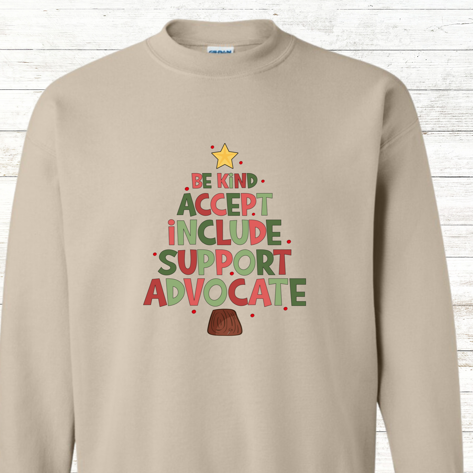 Embrace the true spirit of the holidays with the "Be Kind, Accept, Include, Support, Advocate" Christmas Tree design. Choose your favorite shirt, sweatshirt, or hoodie and spread the message of kindness and advocacy this season!