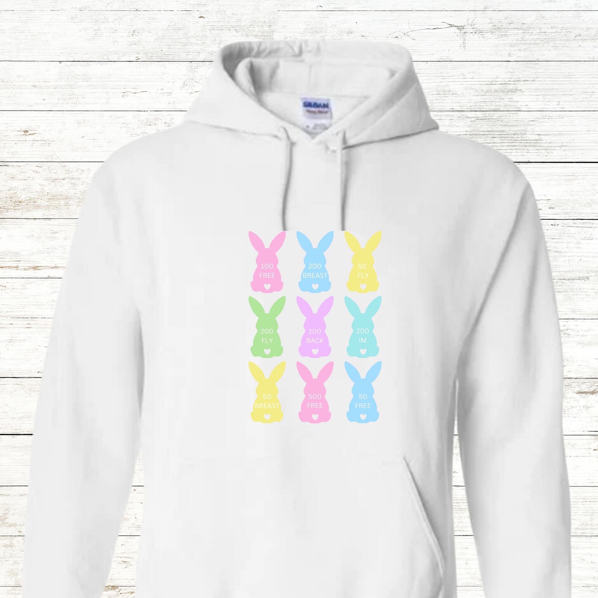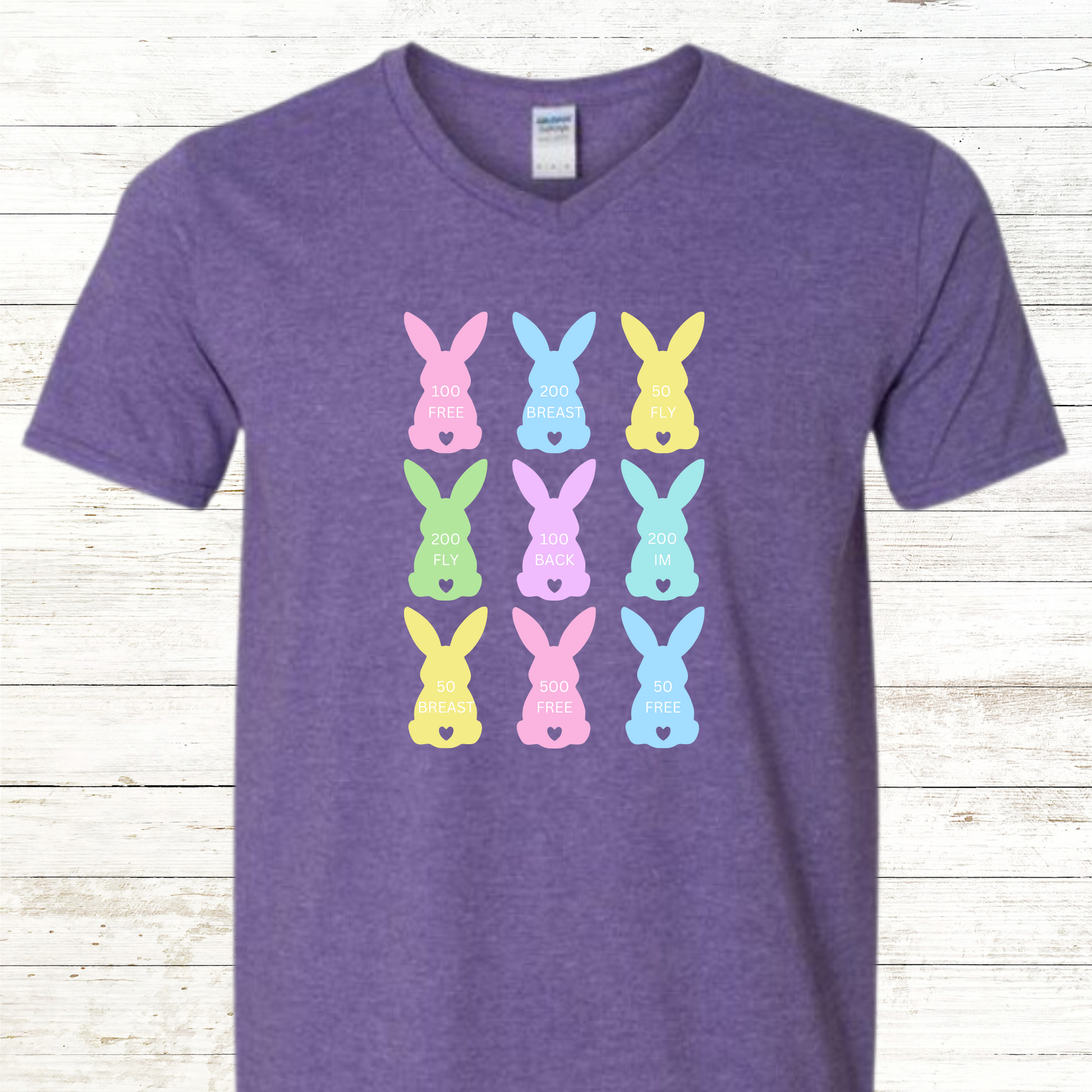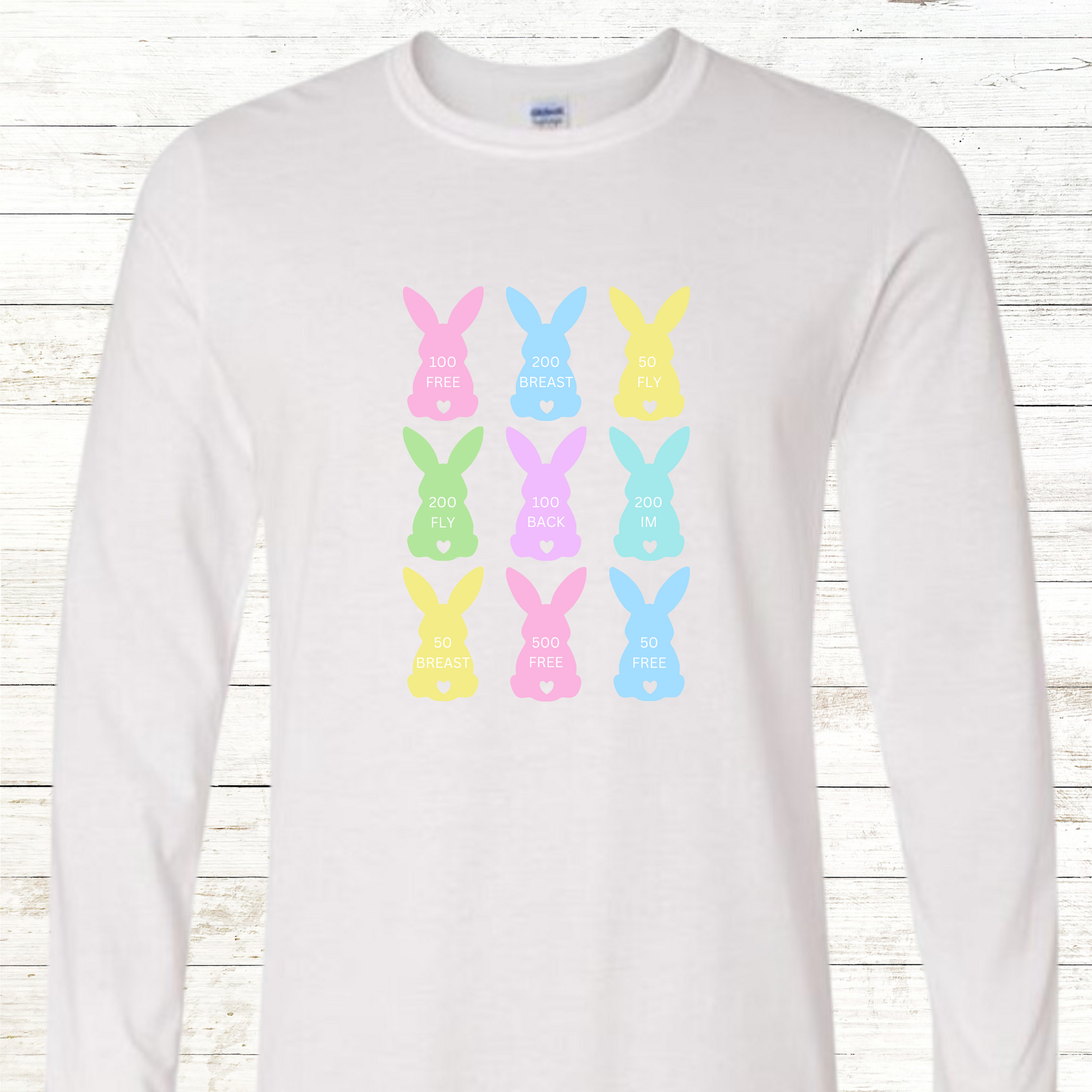 🐰 Dive into Easter with our Swimmer Easter Shirt! 🏊♂️ This egg-citing design showcases adorable pastel-colored bunnies participating in competitive swim meet events, creating a perfect blend of holiday cheer and aquatic excitement.
