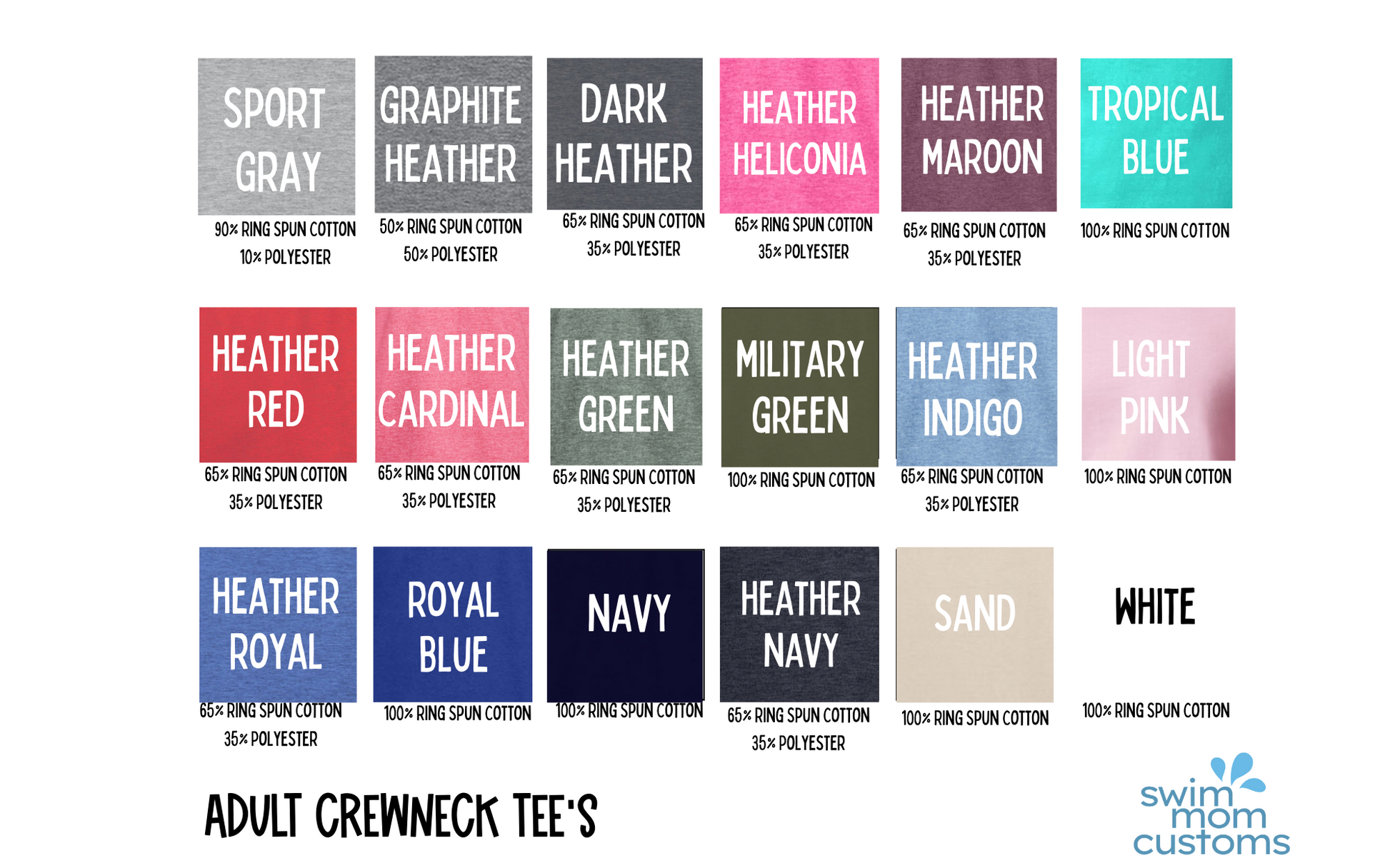 - 65% Ring Spun Cotton / 35% Polyester: Dark Heather, Heather Navy, Heather Royal, Heather Indigo, Heather Maroon, Heather Red, Heather Cardinal, Heather Bronze, Heather Green
