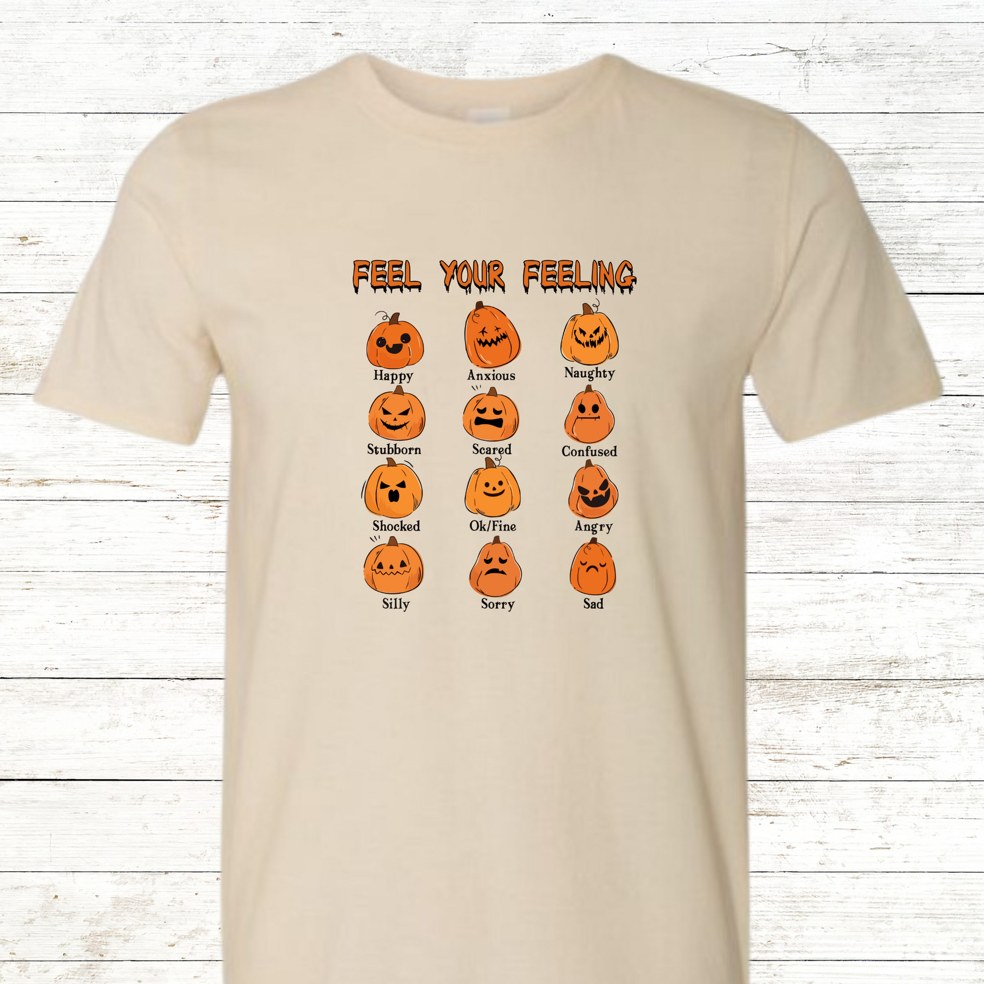 Introducing the "Feel Your Feelings" Collection – a whimsical and expressive design featuring jack-o'-lanterns with different emotions. Perfect for embracing the Halloween spirit while promoting emotional awareness, this exclusive design is available in both tees and sweatshirts, offering comfort and style.