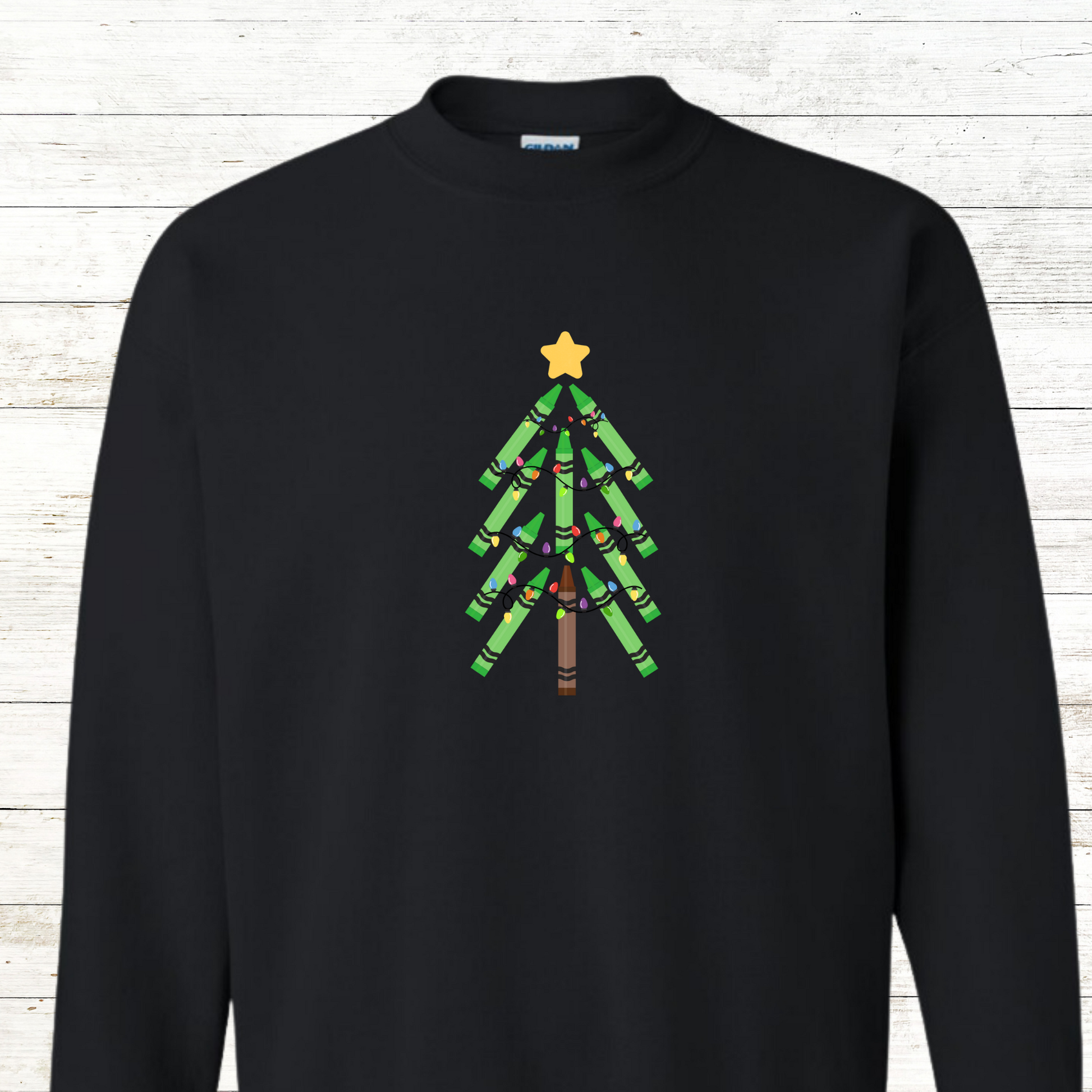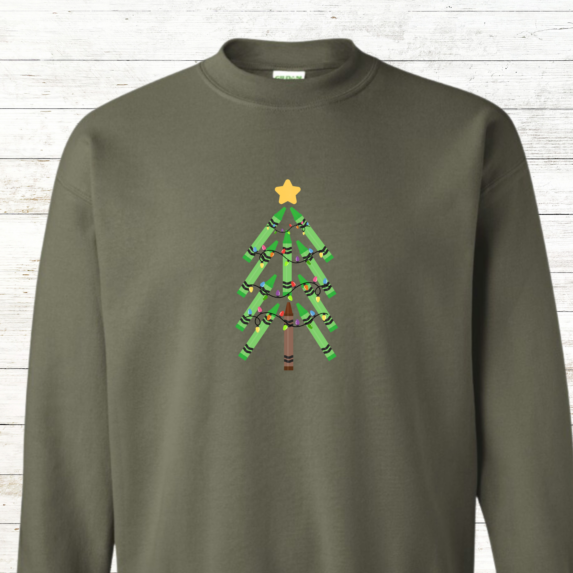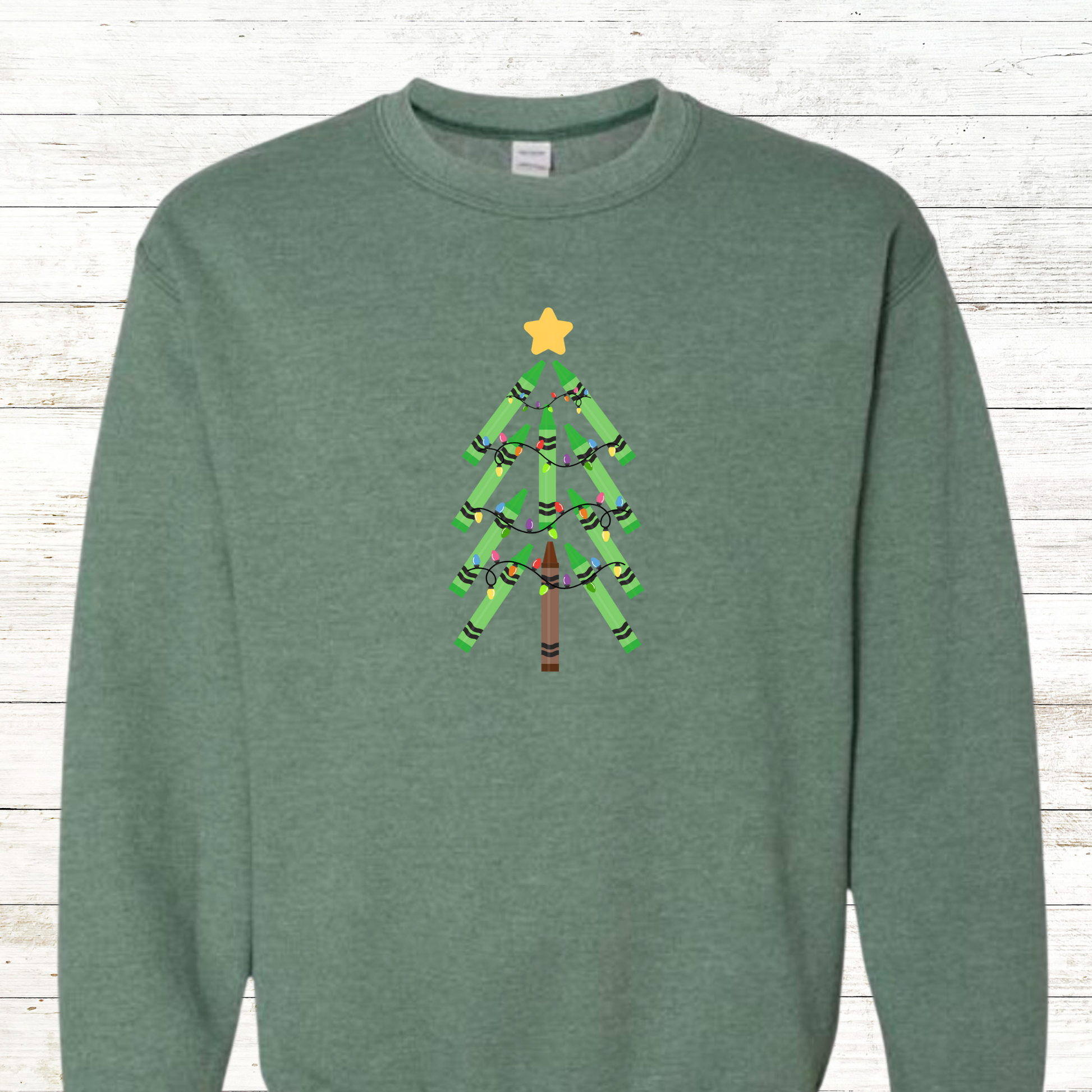Green Crayon Christmas Tree - Teacher / Adult Sweatshirt - Back Personalization Option