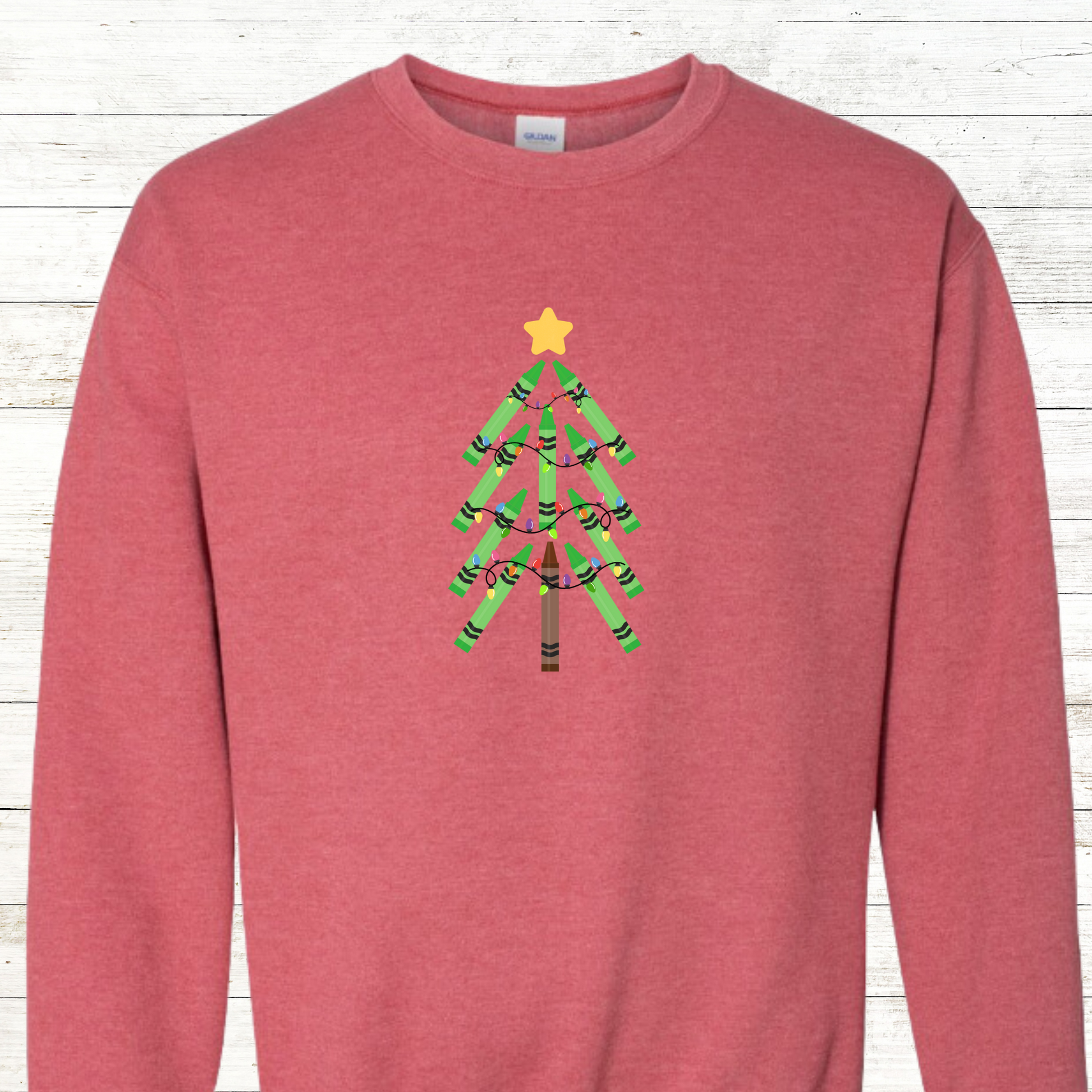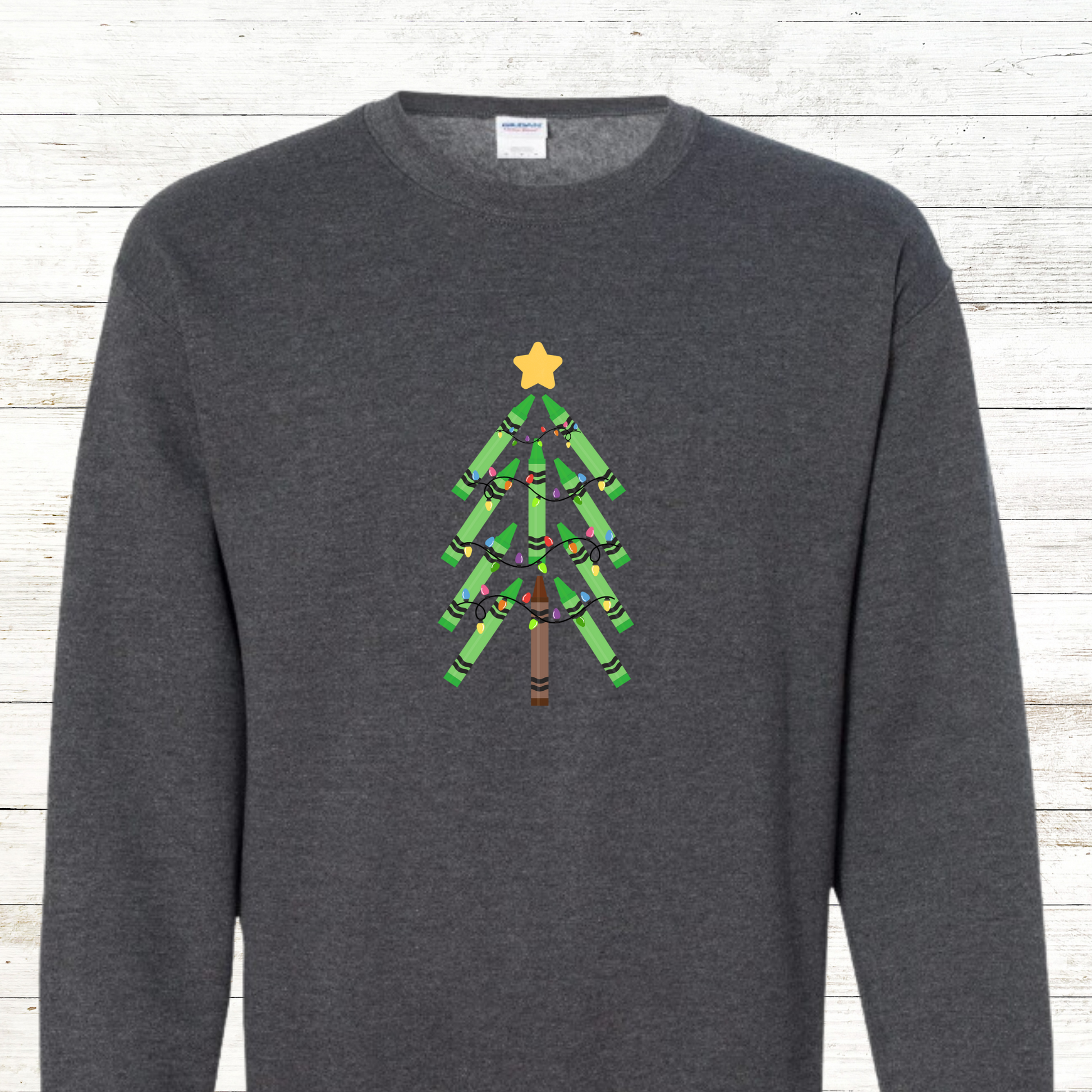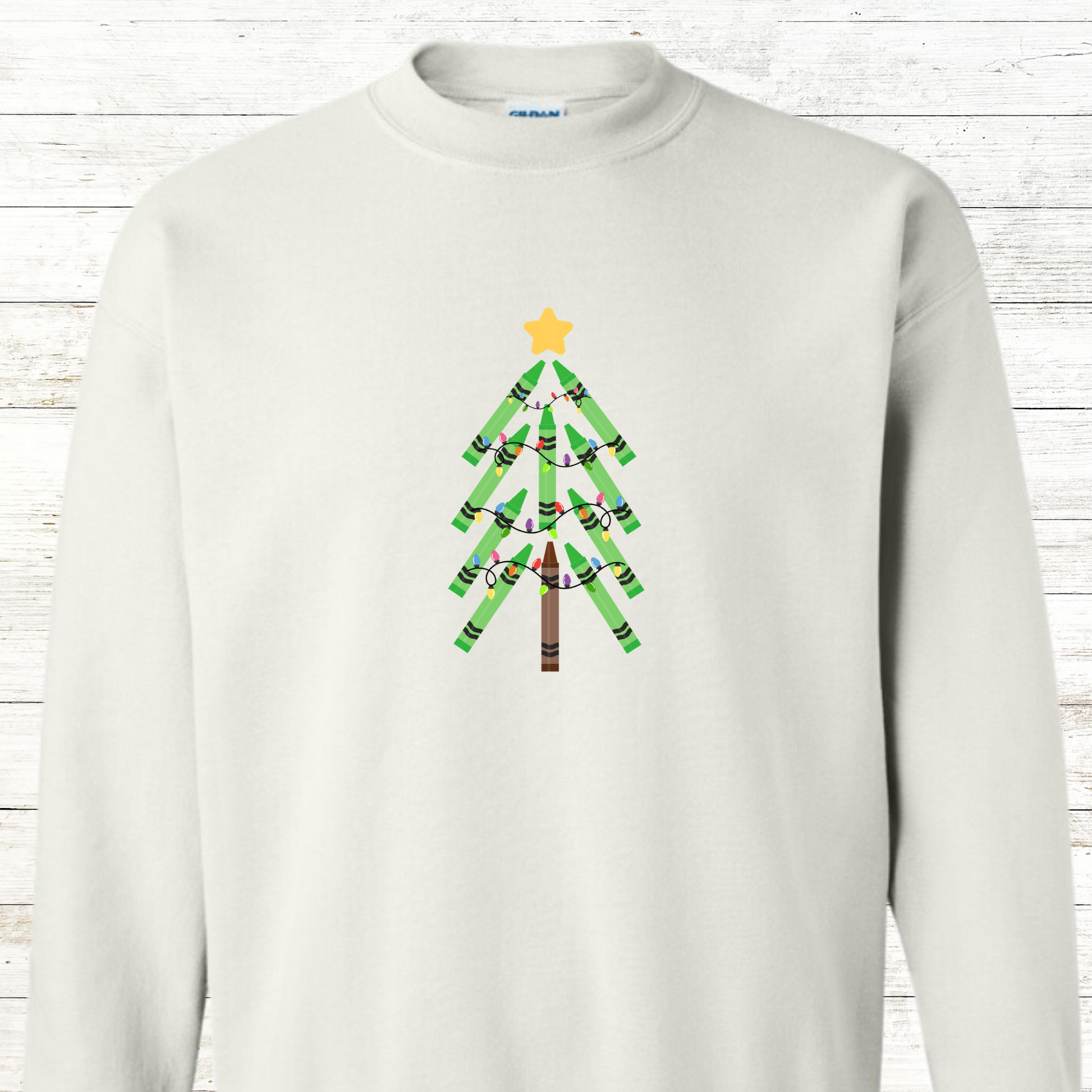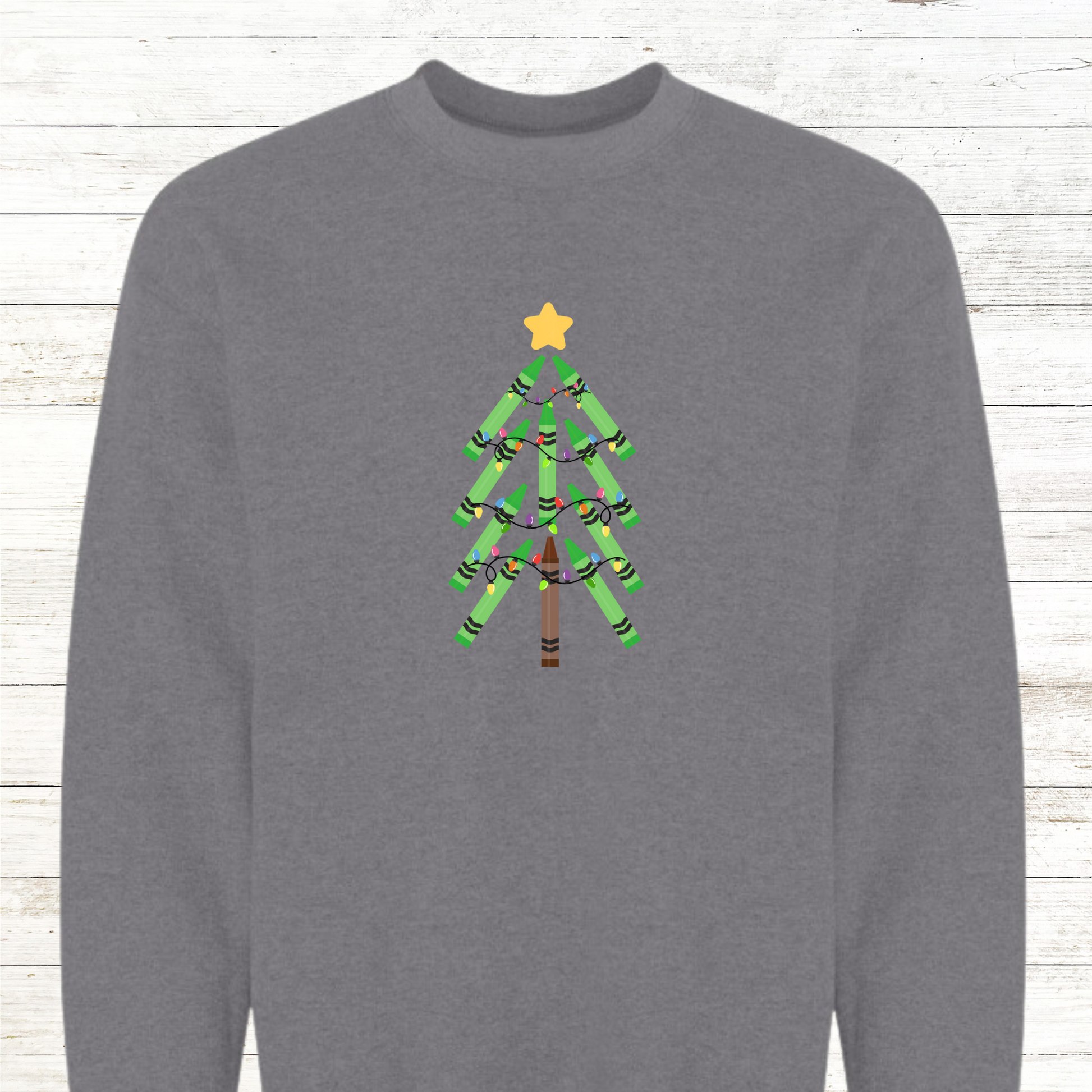 Green Crayon Christmas Tree - Teacher / Adult Sweatshirt - Back Personalization Option
