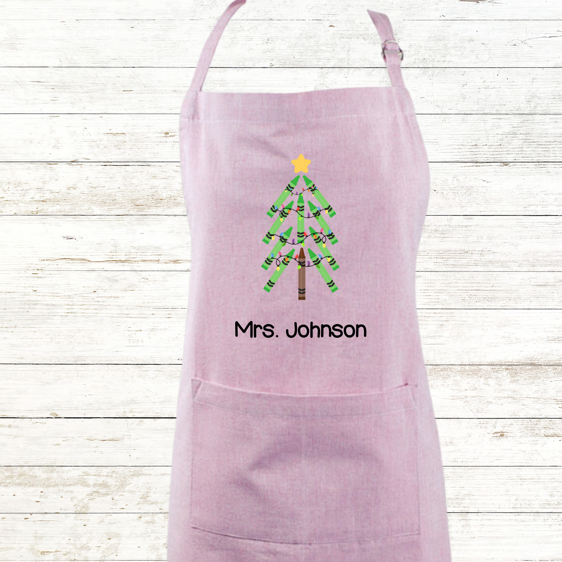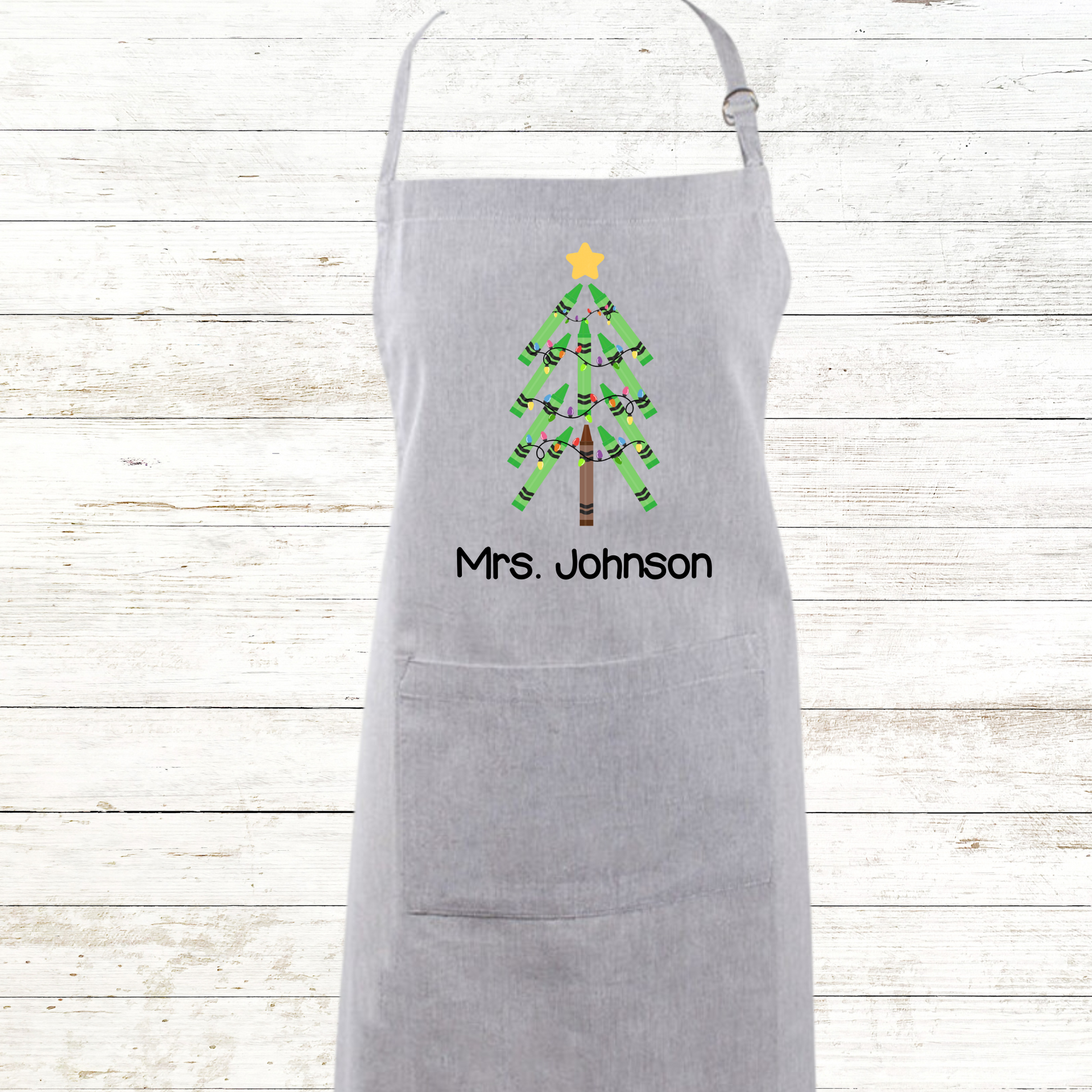 Green Crayon Christmas Tree Teacher Apron Chambray Colors with Front Pocket - Personalized