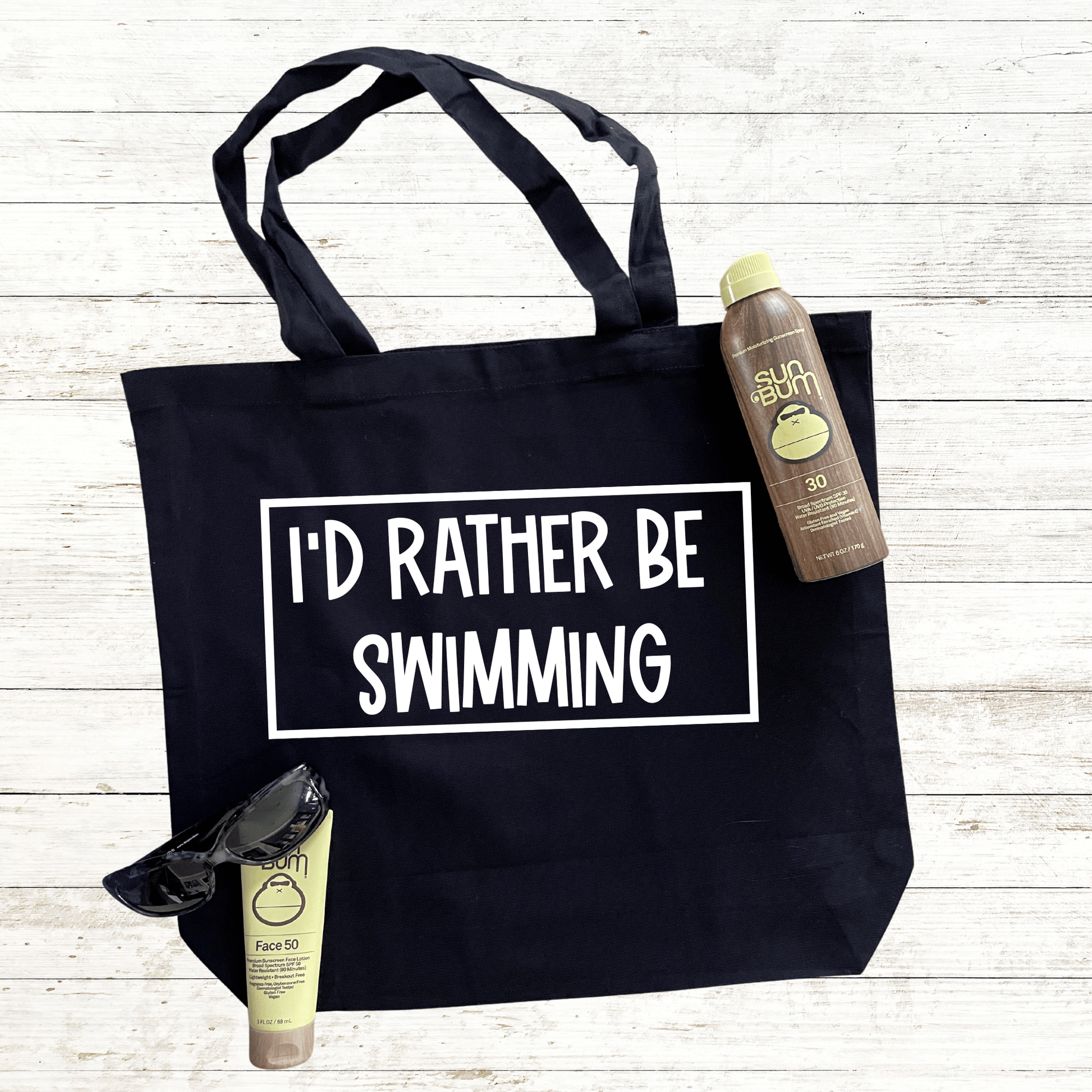 Introducing the "I'd Rather Be Swimming" Tote Bag – a must-have accessory for anyone who loves the water and wants to show it. This tote combines style and practicality with a touch of swimmer’s passion, making it perfect for daily use or trips to the pool.