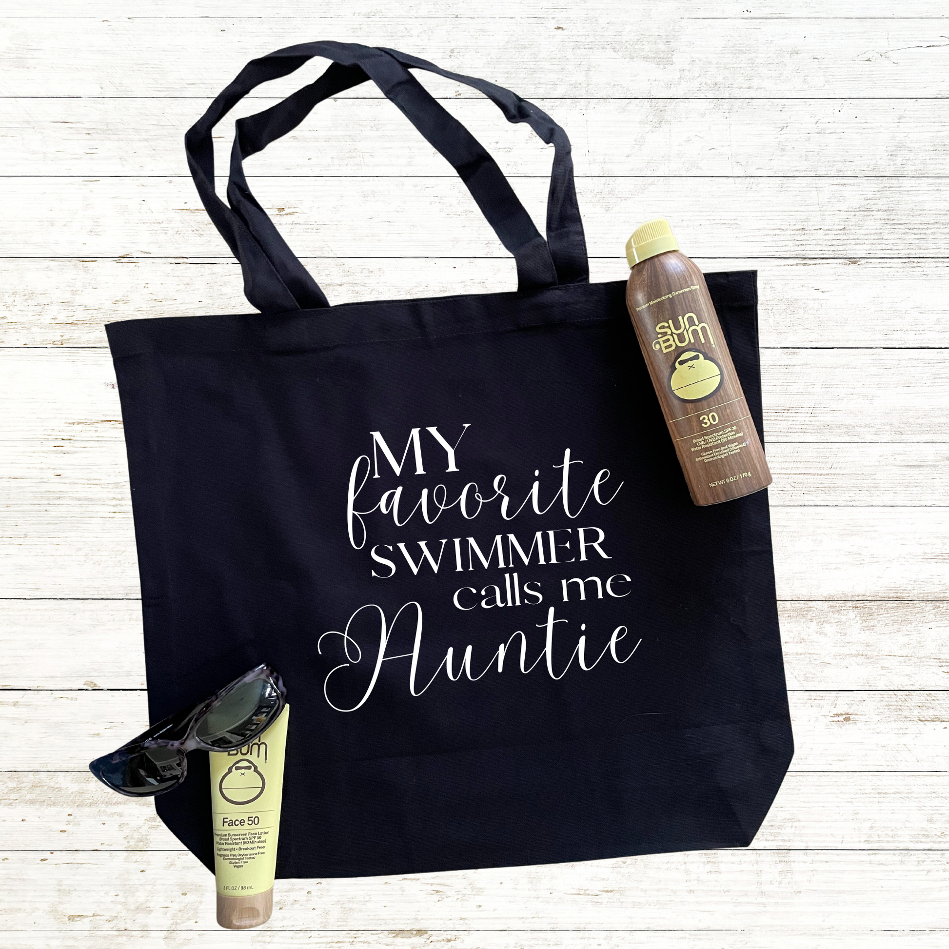 Celebrate your special role as a swim auntie with this personalized tote bag. The front features the loving message “My Favorite Swimmer Calls Me Auntie.”