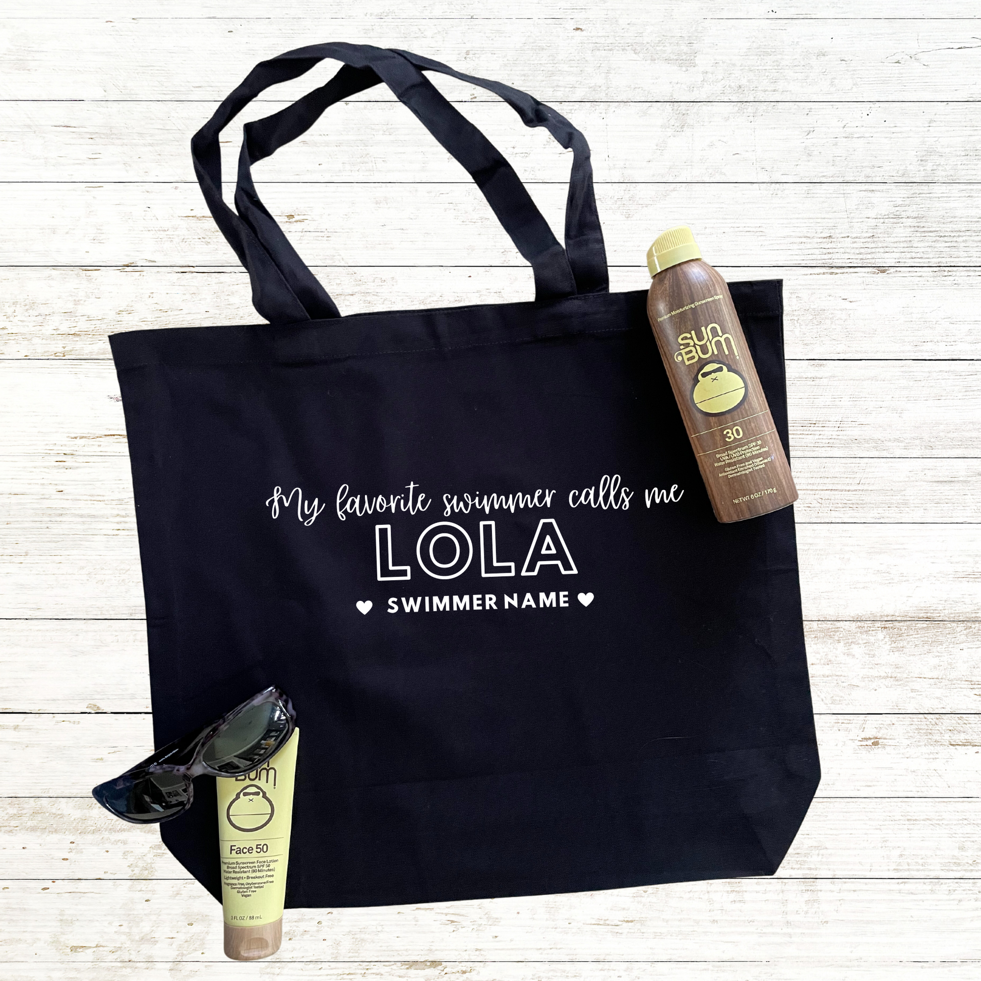 Celebrate your special role as a swim lola with this personalized tote bag. The front showcases the endearing phrase “My Favorite Swimmer Calls Me Swim Lola,” and you can add your swimmer's name for a personal touch that reflects your unique bond.