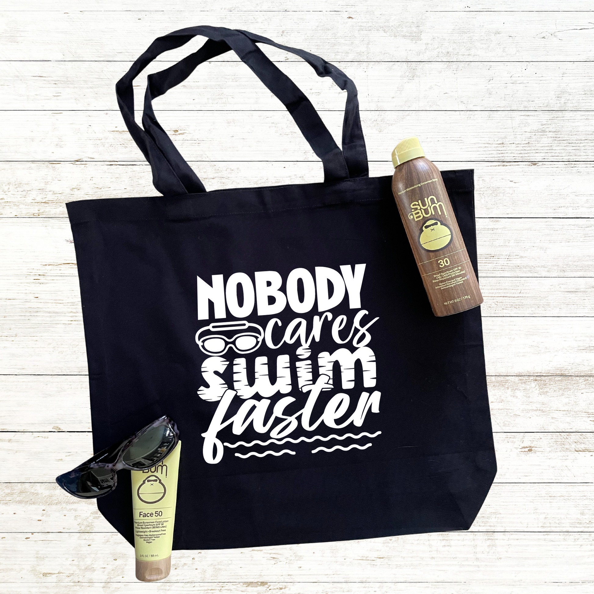 This Nobody Cares Swim Faster Tote Bag comes with free shipping. For an additional charge, the back of this tee can be personalized with a 2 or 3 letter monogram for an added touch.