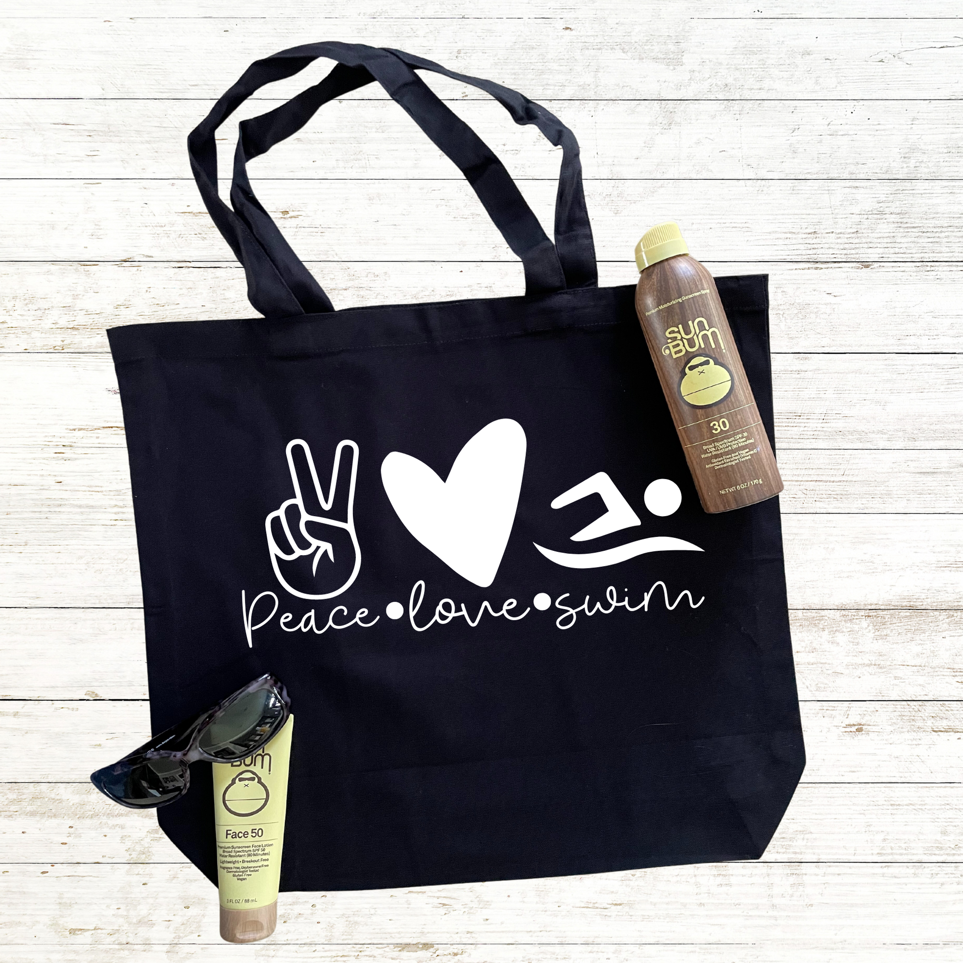 Embrace your passion for swimming with this stylish and meaningful tote bag. Featuring the phrase “Peace Love Swim,” this bag is perfect for swimmers, coaches, and supporters who value a harmonious and active lifestyle.