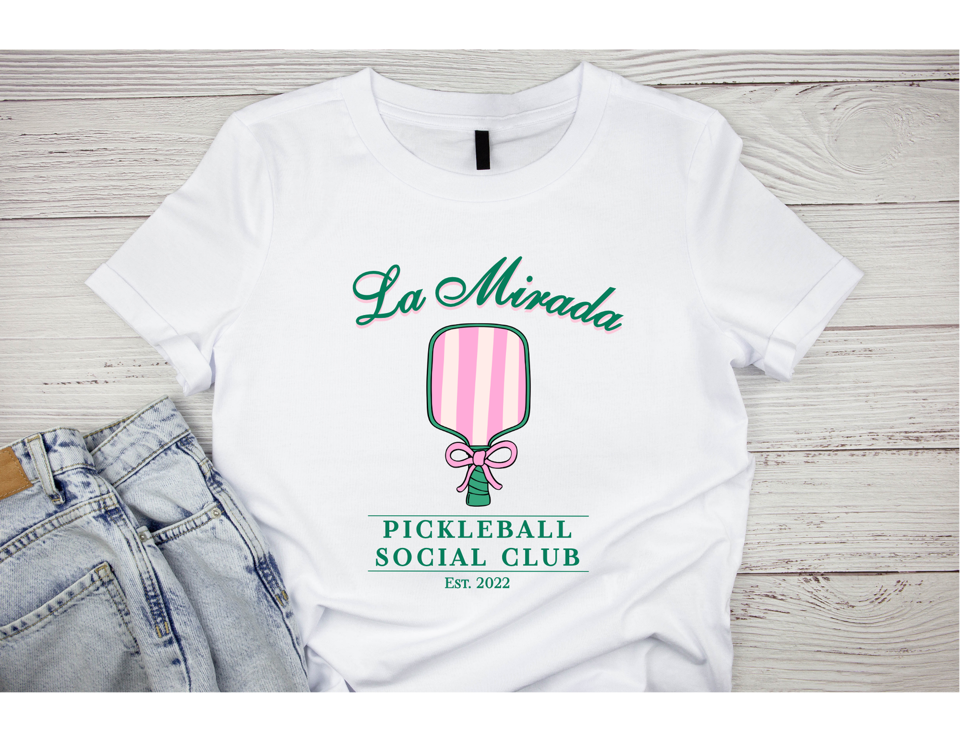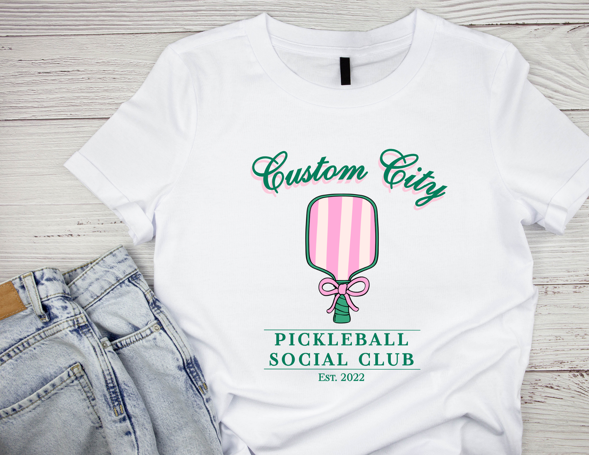 Serve up serious style with our Custom Pickleball Social Club tee! Featuring a playful pastel paddle design and a chic bow detail, this shirt is perfect for casual games, team meetups, or post-match brunch.