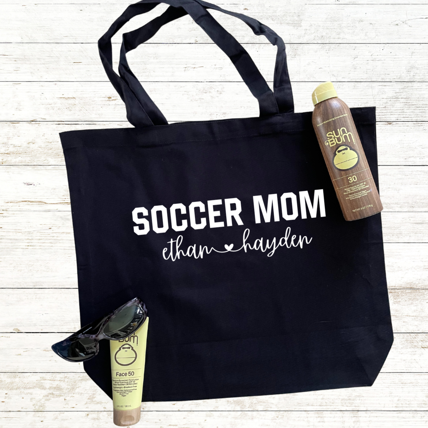 This Personalized Soccer Mom Tote Bag with Player Names comes with free shipping. For an additional charge, the back of this tee can be personalized with a 2 or 3 letter monogram for an added touch.