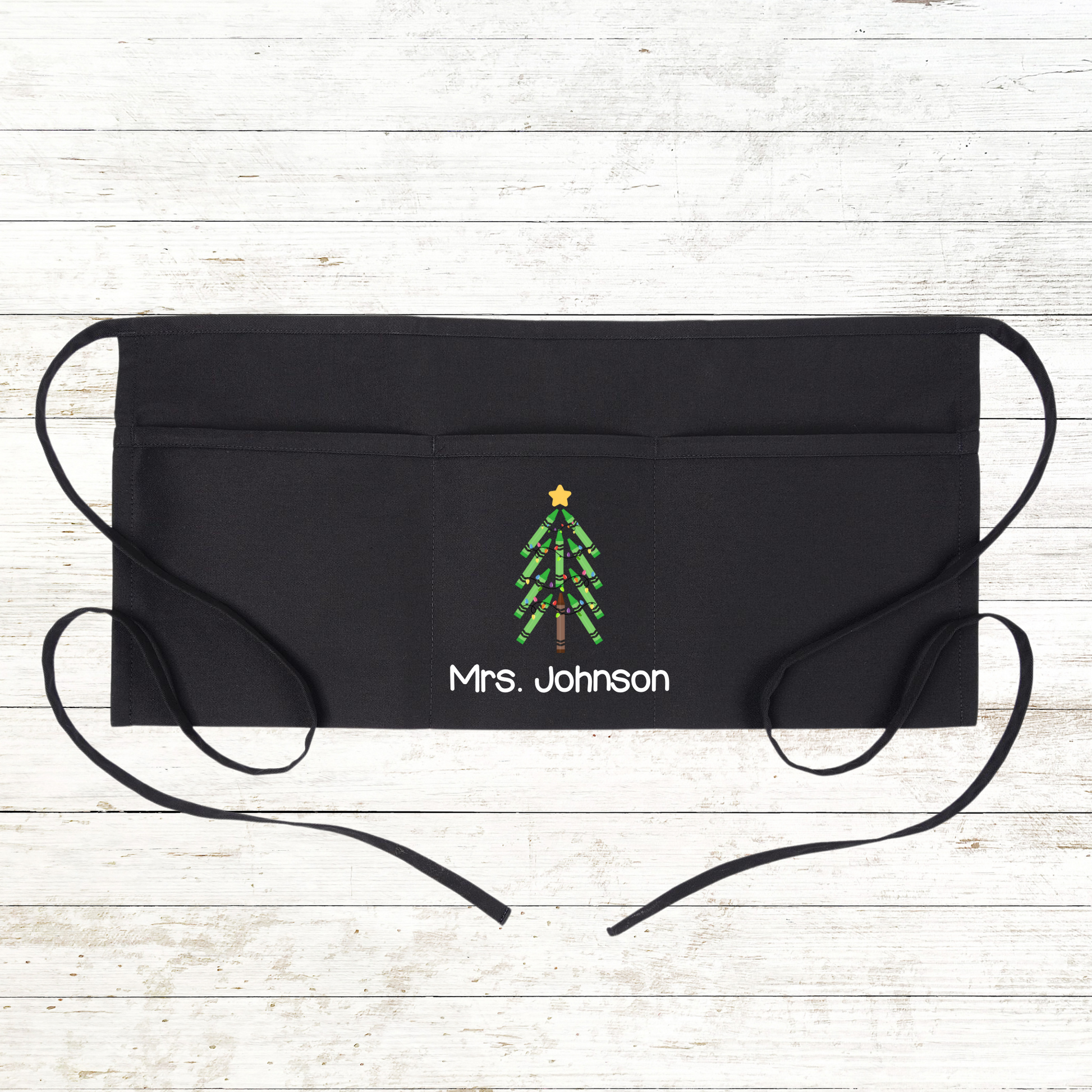 Personalized Teacher Apron with pockets: Green Crayon Christmas Tree