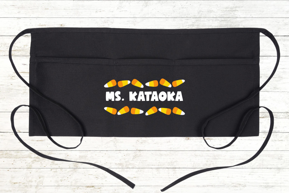 This personalized Halloween Candy Corn apron comes with free shipping. You will receive design proof within 24 hours.