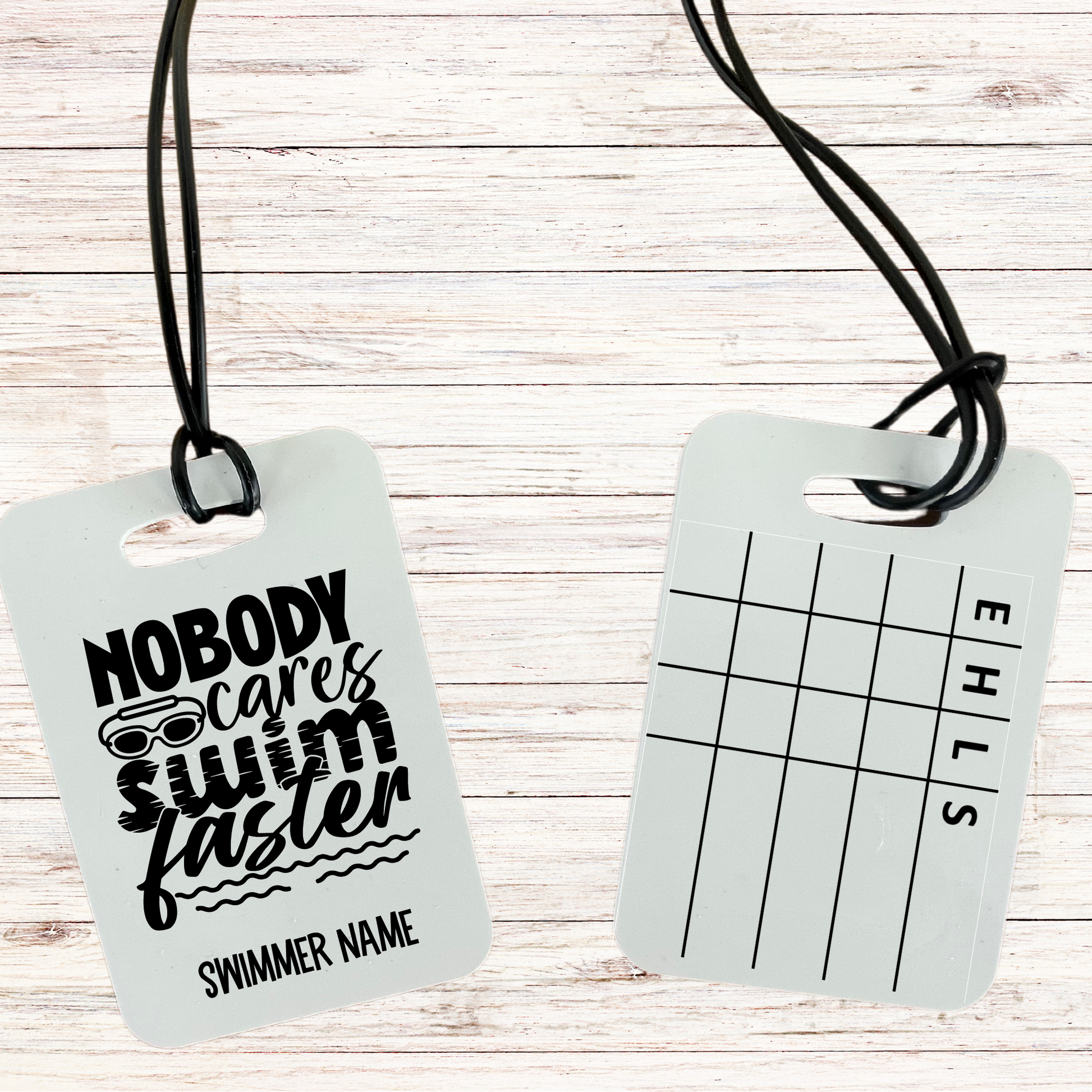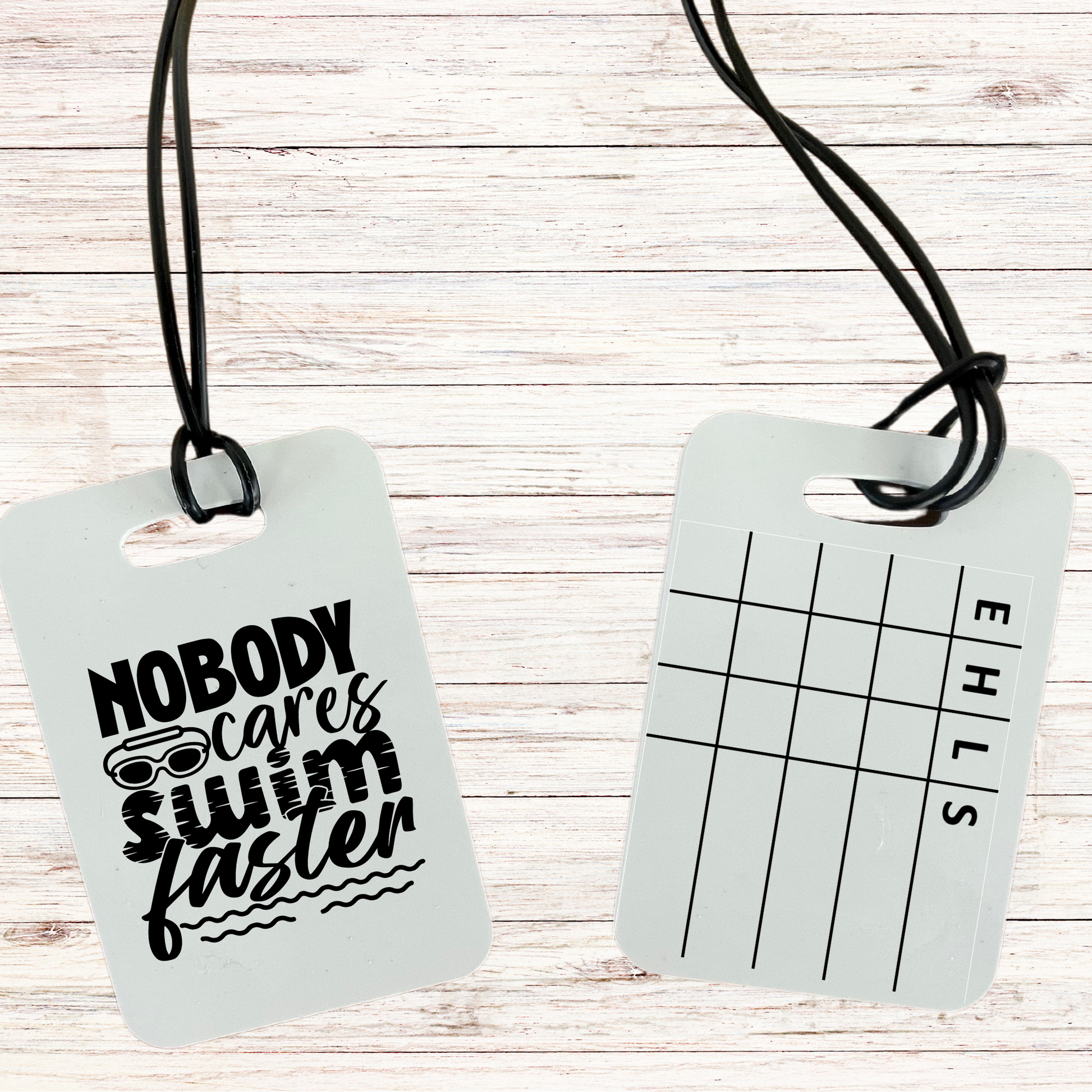 Reusable swim meet heat tag: Nobody Cares Swim Faster