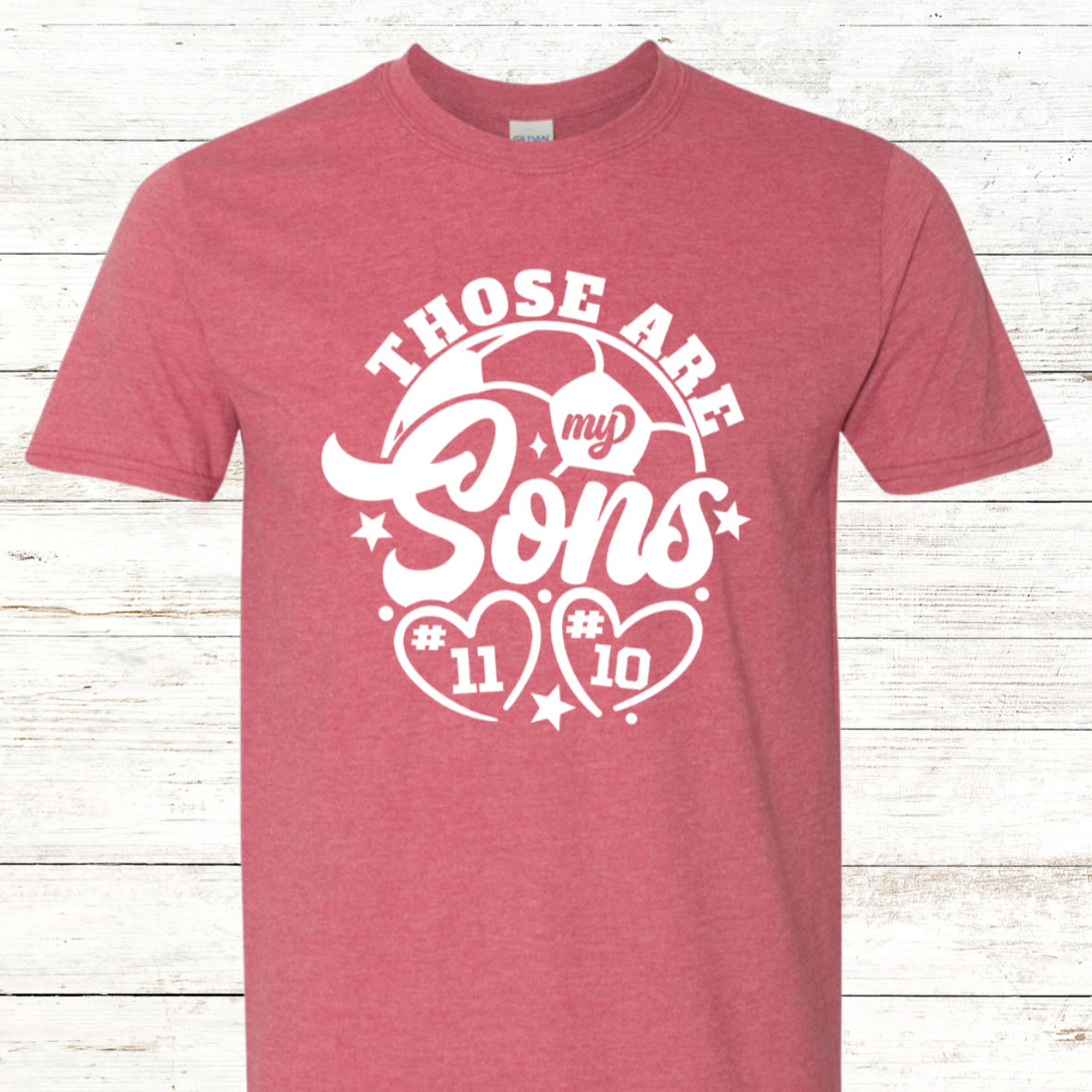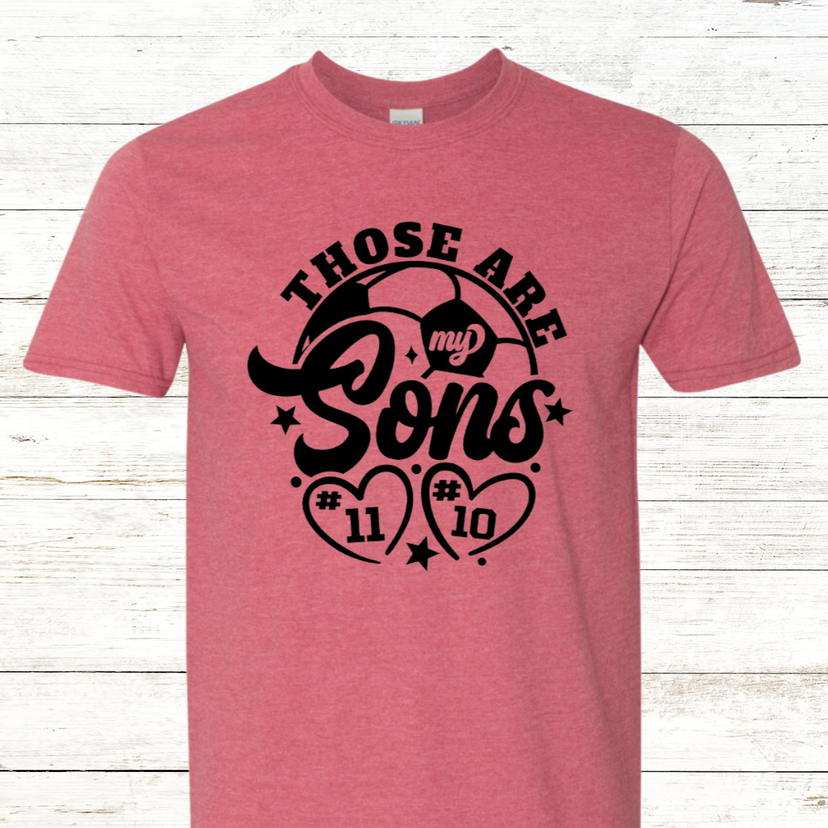 Show your soccer pride with this personalized soccer mom shirt. It features a bold "Those are my Sons" graphic across the front, personalized with your sons' jersey numbers. A great way to represent your family's commitment to the beautiful game.
